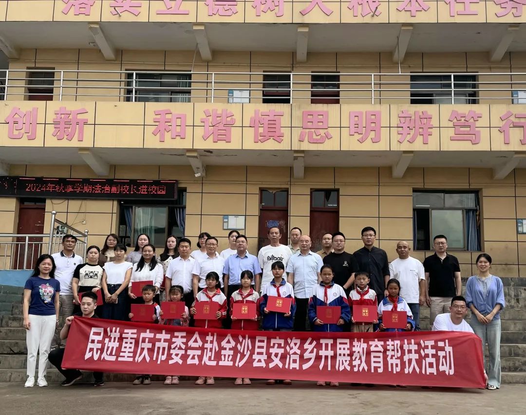 9月9日,民进重庆市委会在贵州省毕节市金沙县开展教师节慰问暨助学捐赠活动。市委会专职副主委罗挺出席,重庆民进企业家联谊会部分代表参加。罗挺一行到金沙县安洛乡中心学??赐课适ι⒕傩斜碚靡鞘健<?023年捐赠4万元后,市委会再次向安洛乡捐赠小桔灯教育奖学金4万元。重庆民进企业家联谊会会长叶星阳、常务副会长王凯分别为获得“小桔灯教育之星”和“小桔灯学习之星”的教师及学生代表颁发获奖证书。罗挺表示,2011年以来,民进重庆市委会认真落实民进中央要求,充分发挥民进在教育领域的特色优势,积极组织开展图书捐赠、送教下乡、结对共建等帮扶活动,逐步探索形成西部乡村教师公益培训和小桔灯专项基金表彰奖励两个系列