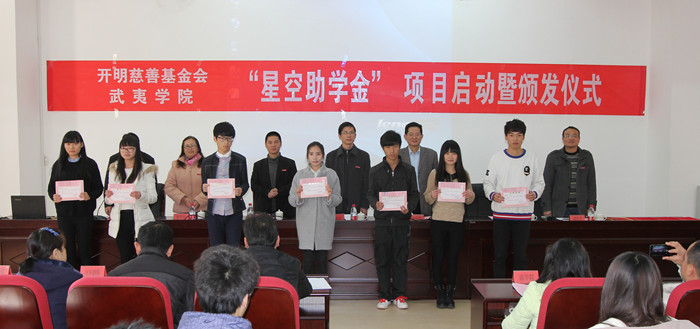 12月17日,开明慈善基金会“星空助学金”项目启动暨颁发仪式在武夷学院科技楼报告厅隆重举行。民进福建省委会秘书长、开明慈善基金会星空专项基金管委会主任林全金,南平市政协副主席、民进南平市委主委、武夷学院校董事会常务副董事长郭翠莲,福建民进经济界会员联谊会会长、开明慈善基金会星空专项基金管委会副主任、武夷学院董事、福建新思路集团董事长王东平,武夷学院副校长吴承祯出席了仪式。武夷学院学生处、教务处领导、教师代表和100名受资助学生参加了仪式。仪式由学生处副处长刘廉明主持。 项目启动暨颁发仪式上,开明慈善基金会星空专项基金与武夷学院签订设立武夷学院星空助学项目协议,专门向武
