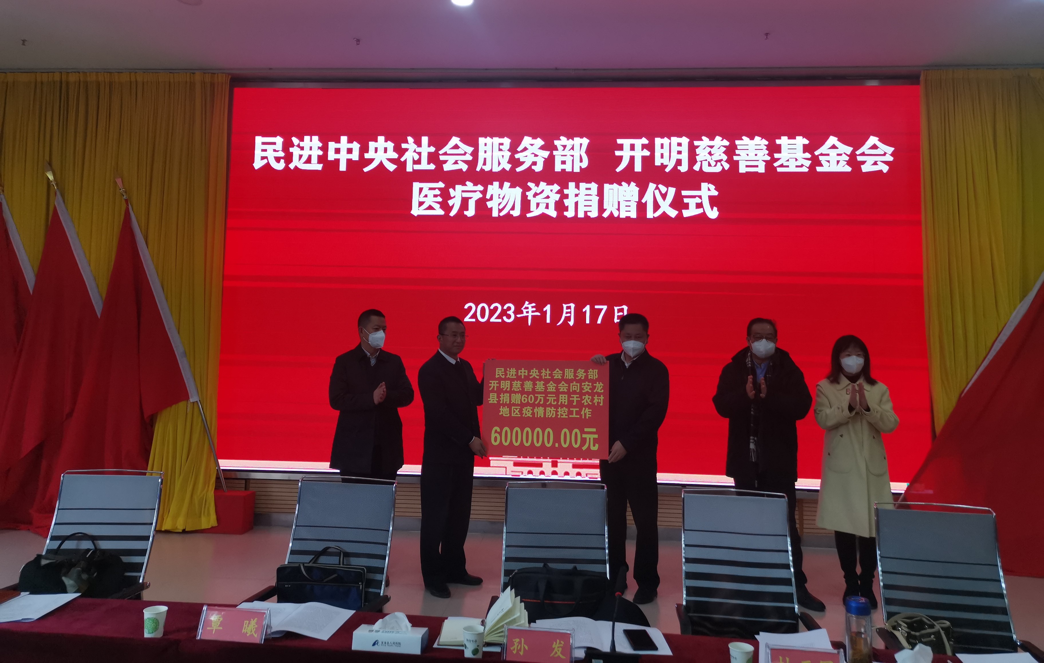 同心抗疫,寒冬送暖。为贯彻落实国家乡村振兴局全国农村地区新冠疫情防控工作视频会议精神,在民进中央社会服务部的协调下,针对当前春节返乡人员增多,农村地区防疫物资保障不足,医疗卫生服务能力较弱等问题,开明慈善基金会积极开展“迎新春 送温暖”助力农村疫情防控行动。1月17日,医疗物资捐赠仪式在贵州安龙县举行。民进贵州省委会主委、省卫健委主任孙发代表民进中央社会服务部、开明慈善基金会出席捐赠仪式。此次“迎新春 送温暖”助力农村防疫爱心物资捐赠活动,向民进中央定点帮扶安龙县捐赠善款60万元,用于当地11个乡镇采购血氧仪、排痰机、雾化器等医疗设备和防疫物资,及时为农村地区送去关爱,助力当地疫情平