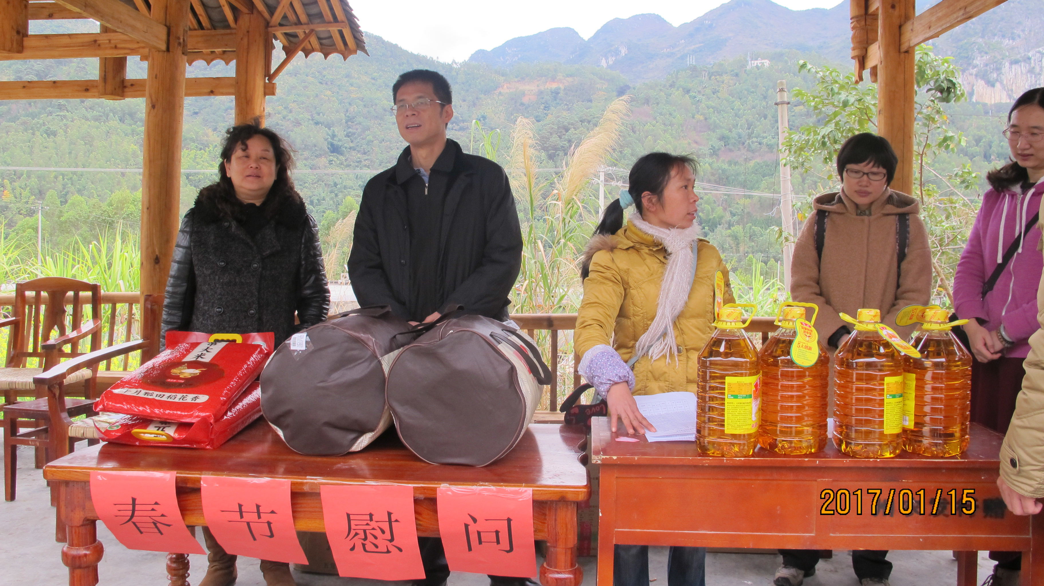 2017年1月15上午,由民进中央办公厅副主任、机关中共支部书记石树梅带队,民进中央机关中共支部、民进支部、工会、团总支、开明慈善基金会代表组成联合调研组,一行5人在黔西南州安龙县坝盘村开展了春节慰问、走访贫困户、考察坝盘村建设情况活动。 调研组一行向26户贫困户发放发放慰问金和慰问品,走访慰问部分留守老人,与他们进行了交流。 活动期间,黔西南州人大常委会副主任、民进黔西南州委会主委黄健勇,民进黔西南州委会副主委廖静,民进中央研究室联络处副处长、安龙县挂职副县长吴晓知,安龙县政协副主席、民进安龙县支部主委杨琨,民进中央挂职干部、中共