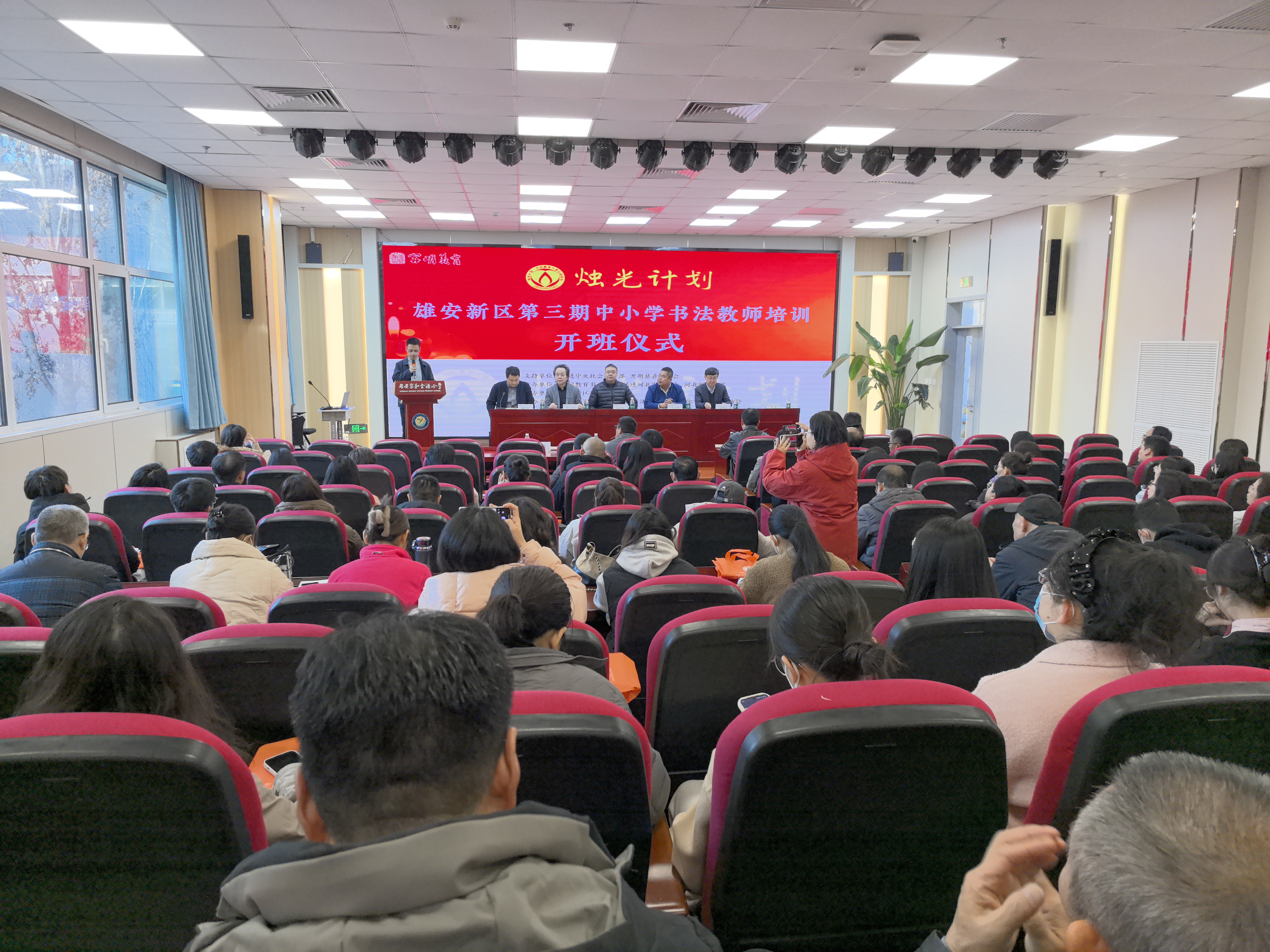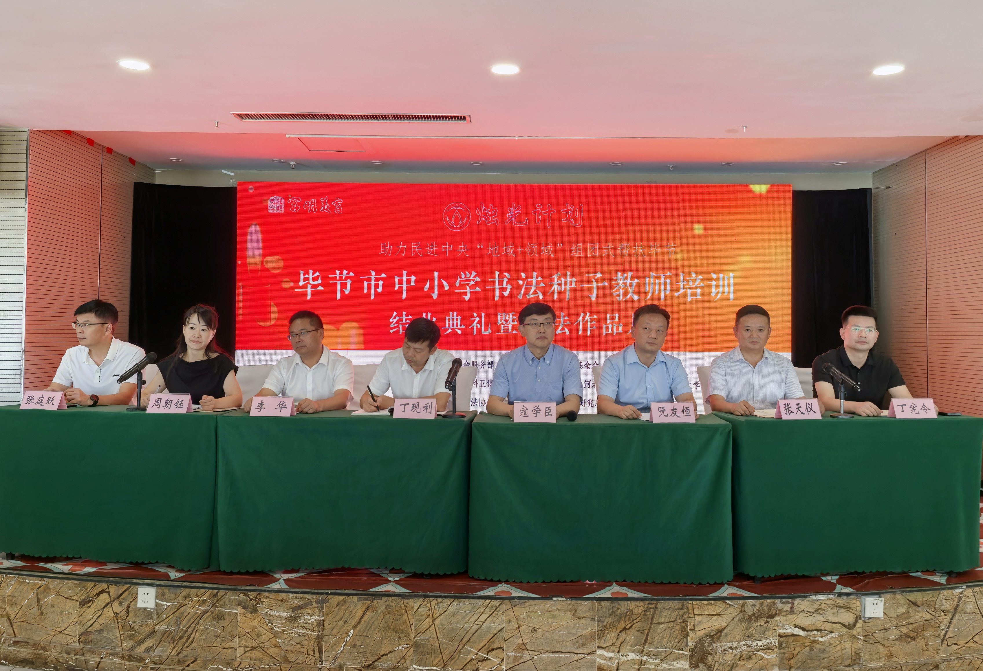 8月25日至28日,为助力民进中央“地域+领域”组团式帮扶毕节工作,在开明慈善基金会支持下,“烛光计划”再度走进贵州省毕节市,举办中小学书法种子教师培训。培训现场来自毕节市九个县区的50名书法种子教师及黔西市32名语文兼书法教师齐聚现场,全国百余所“烛光计划”书法实验校的教师也通过线上方式同步参与。开明慈善基金会秘书长武俊涛致辞民进河北省委专职副主委刘建华,开明慈善基金会秘书长武俊涛,民进贵州省委开明书画院执行院长宋天宇,毕节市中小学示范性综合实践活动中心主任阮友恒,民进毕节市工委专职副主委李华,黔西市委常委、统战部部长丁现利,黔西市教育局局长丁宪令,黔西市政协副主席、民进黔西市支部主委周朝钰