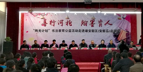 12月21日,由开明慈善基金会资助的书法教育大型公益活动——同心彩虹行动·美育共建 “烛光计划”走进雄安新区启动仪式在河北省安新县举行。河北政协教科卫体委员会主任栗建华、民进河北省委副主委张运凯、河北师大纪委书记杨士彬,中国硬笔书法协会副主席副主席陈联合,河北书协副主席刘宗超、硬笔书协主席寇学臣出席,安新县政协副主席王伟林,教育局局长臧建彬,以及来自新区的200余名师生代表参加了启动仪式。 开幕式上,主办单位向当地捐赠了2000册书法教材和4套书法教学软件,授牌建立了4所“烛光计划·百所乡村学?!保侔炝诵郯残虑甙残孪厥灼谑榉ń淌ε嘌蛋?。栗建华、张运凯、陈联