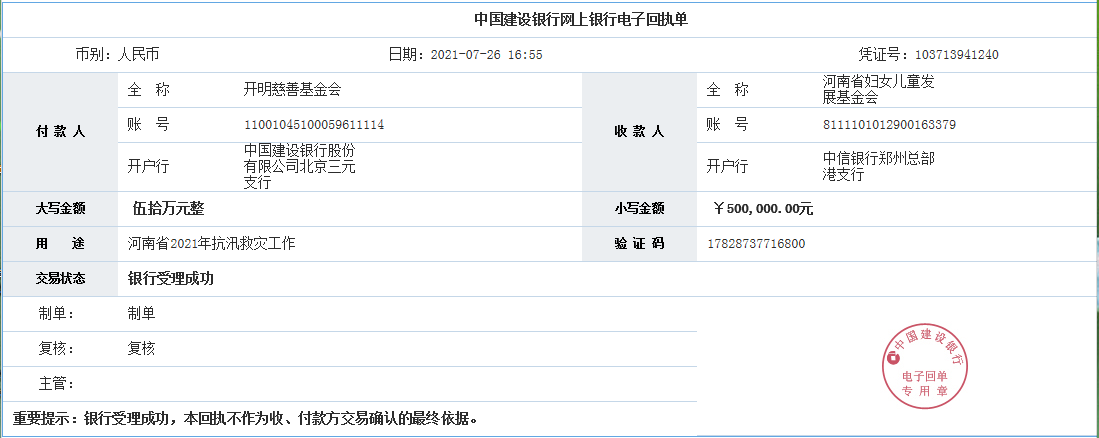 7月16日以来,一场范围广、强度大、持续久的降雨袭击河南,引发罕见汛情灾情。据初步统计,截至26日12时,此轮强降雨造成全省150个县(市、区)1558个乡镇1290.74万人受灾,因灾死亡69人。风雨同舟,众志成城。习近平总书记对防汛救灾工作作出重要指示,党中央国务院统筹部署??鞔壬苹鸹嵩诨煊χ泄仓醒牒耪伲硎鲁で囟叨裙刈⒑幽显智辞?,并第一时间倡议爱心企业、爱心人士等社会各界力量纷纷参与救灾行动。为了将社会各界的爱心善款尽快用于抗洪救灾一线,基金会与民进河南省委会沟通联系,向河南省妇女儿童发展基金会捐赠100万元善款,支援此次特大洪涝灾害救援工作,帮助受灾群众共渡难关。一方有难