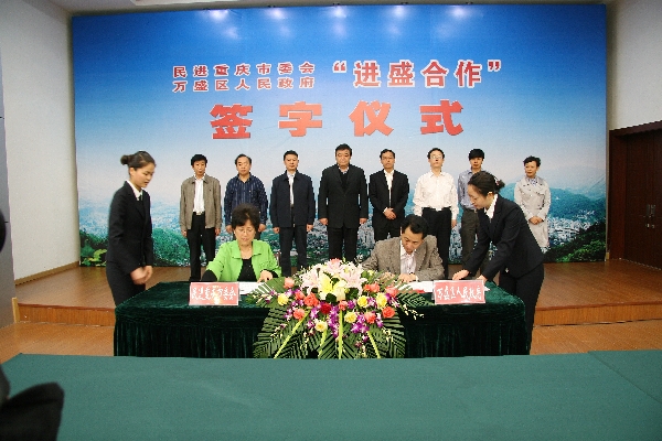 2010年5月13日民进重庆市委与万盛区签定第四轮合作协议“进盛合作”是民进重庆市委会探索服务地区发展途径的积极尝试。二十年的坚持,“进盛合作”已成为民进重庆市委会的品牌工程,享誉重庆。 1992年6月6日,民进重庆市委会与重庆市万盛区人民政府携手签定“关于教育、科技、旅游、文化智力”合作协议,开始了民进组织与地方政府合作发展的探索之旅,也拉开了“进盛合作”的盛典大幕。从此重庆民进开始植根于万盛这块沃土,展开了二十年的合作探索。 办好一所学校 育出万千学子 万盛地处渝黔交界的大娄山麓,由于多种因素制约,该区急需在教育发展取得突破。经过多年探索,民进重庆市委决定支持