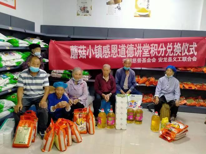 在贵州省黔西南州安龙县易地扶贫搬迁安置点蘑菇小镇,开明慈善基金会“开明感恩道德讲堂”项目持续开展。通过“开明感恩道德讲堂”提升新市民思想道德素养,并用听课换积分形式在“开明新生活超市”免费换取生活用品。