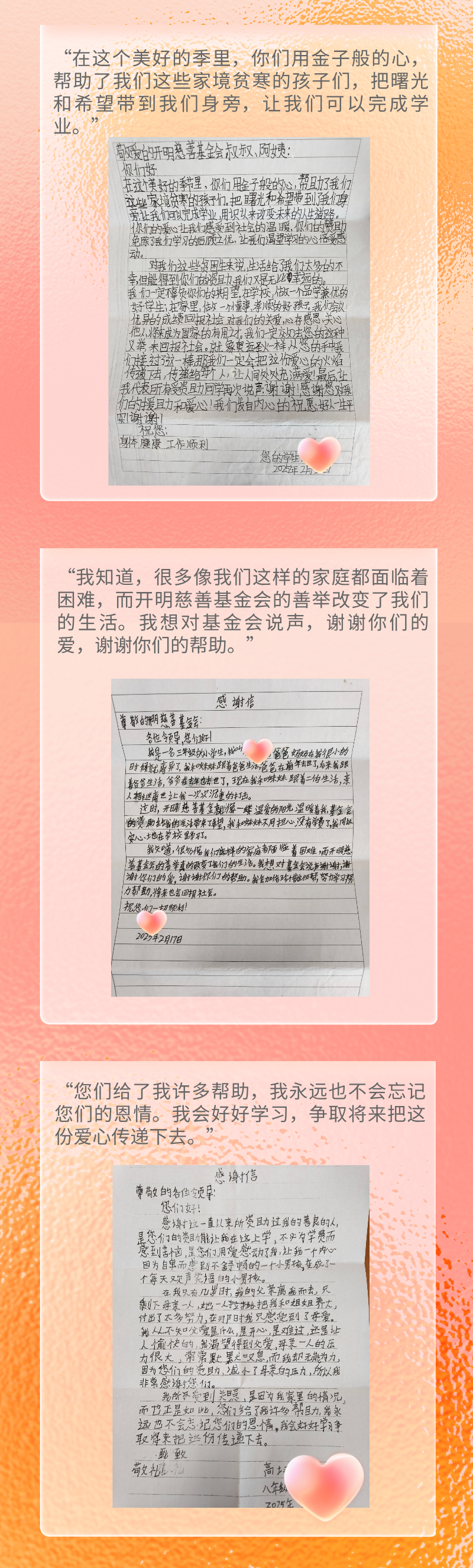 这些孩子,或许正面临着生活的困境,但他们用努力和坚韧,书写着属于自己的精彩篇章。孩子们的来信,是爱的回响,我们期待,这份爱能成为他们成长路上的温暖陪伴,助力他们飞得更高、更远。
