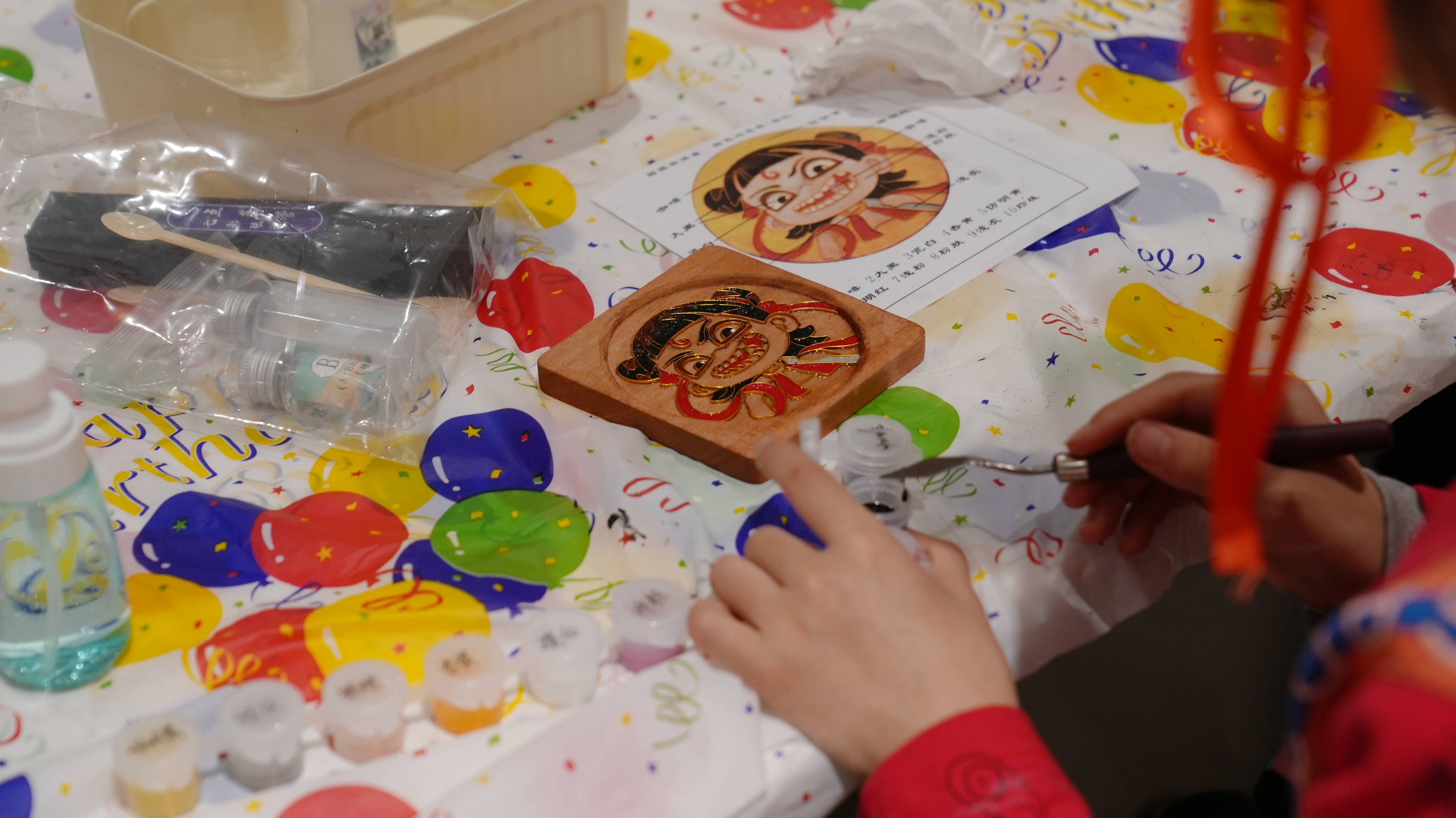 手工制作环节,孩子们在工作人员的指导下,亲手制作哪吒主题掐丝珐琅杯垫,体验非遗技艺的魅力。