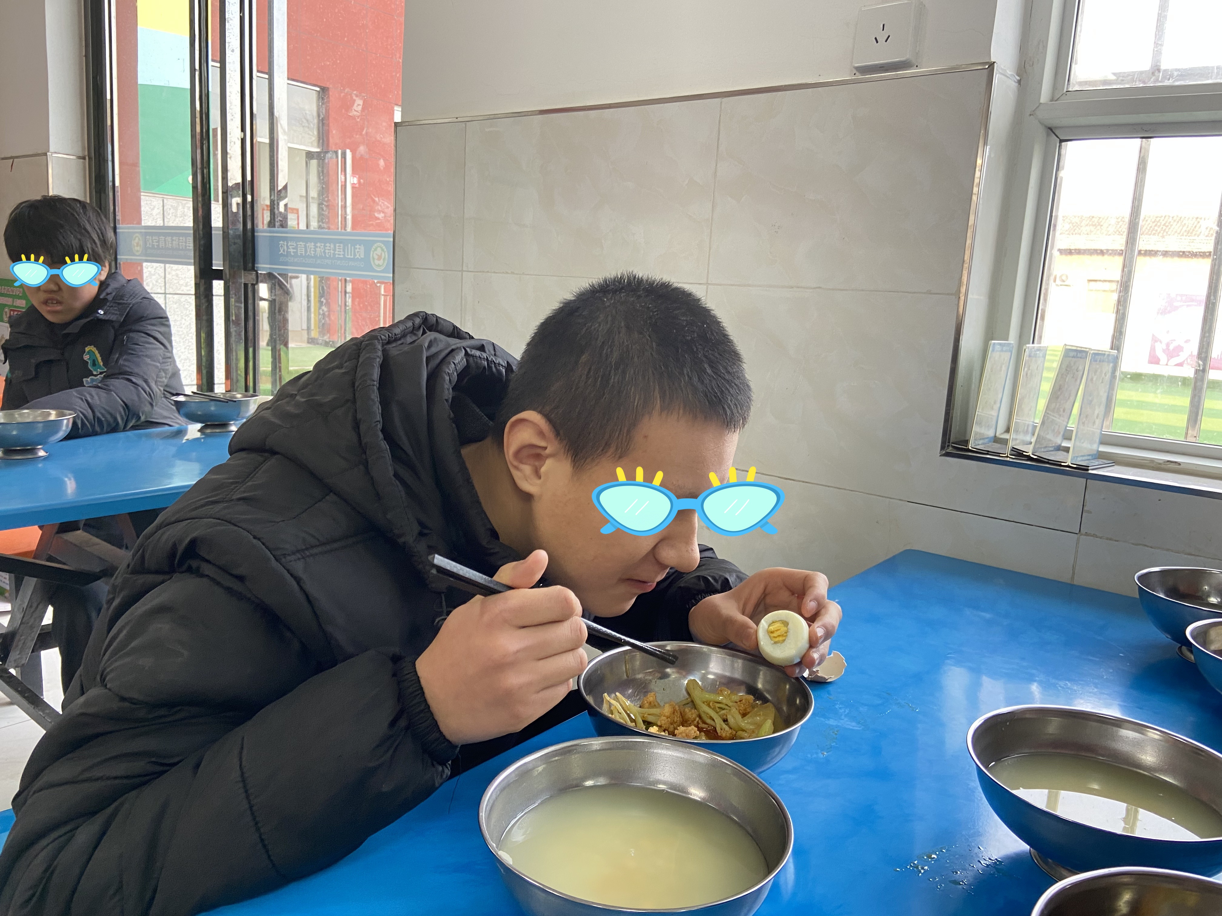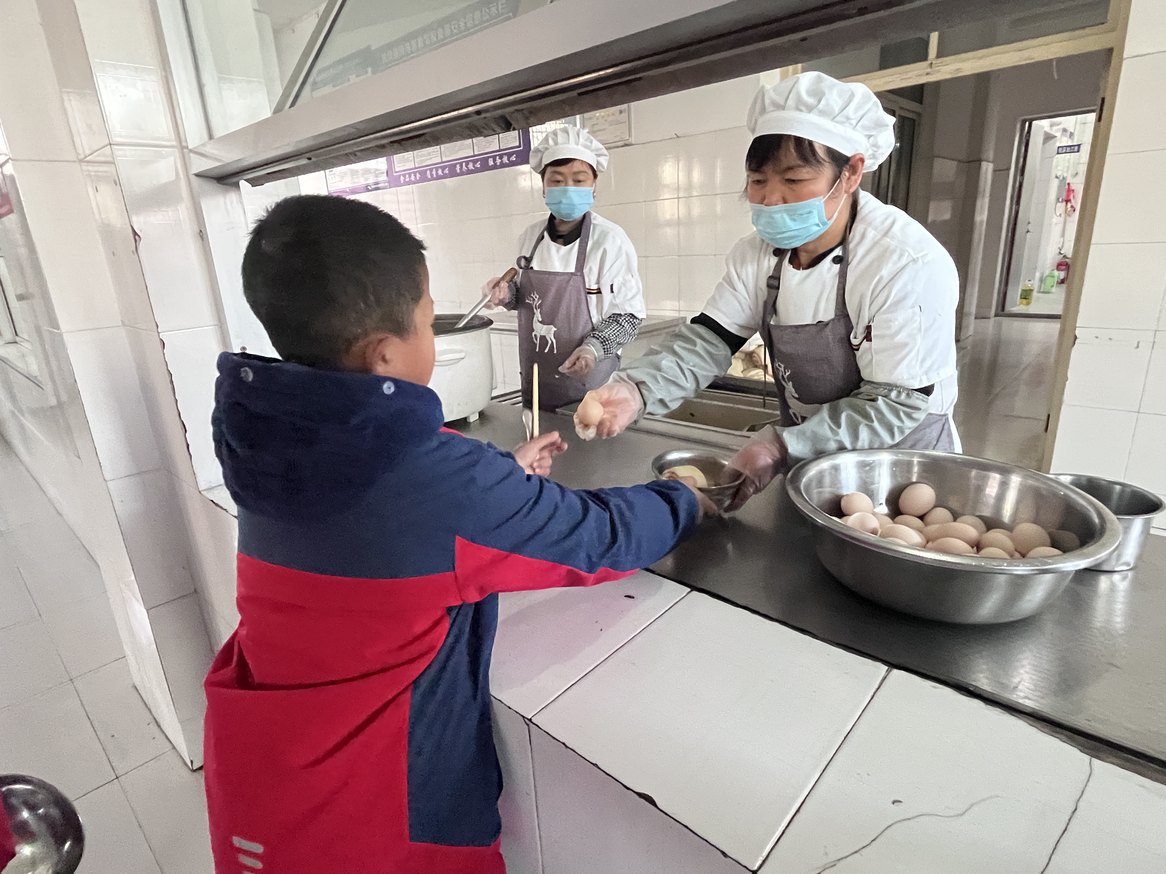 早晨走进扶风县特殊教育学校师生餐厅,恰逢赶上老师发鸡蛋的时间,这时孩子们都整齐的在窗口排队打餐,孩子们接过鸡蛋,露出笑脸......