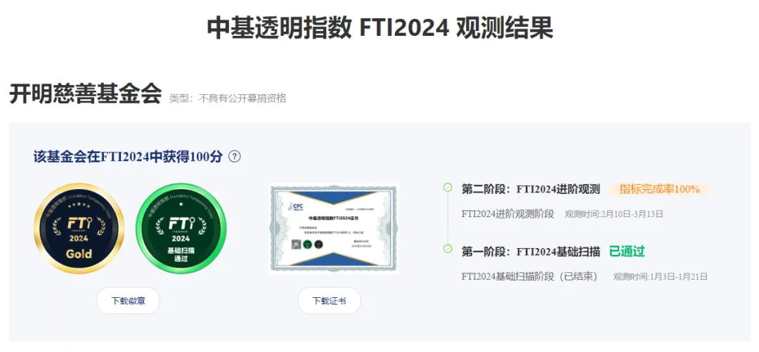 3月21日,基金会中心网发布中基透明指数FTI2024榜单,开明慈善基金会凭借在信息公开领域的卓越表现,顺利通过“基础扫描+进阶观测”双阶段评估,再次获得满分100分。至此,开明慈善基金会连续三年获得该指数测评满分。