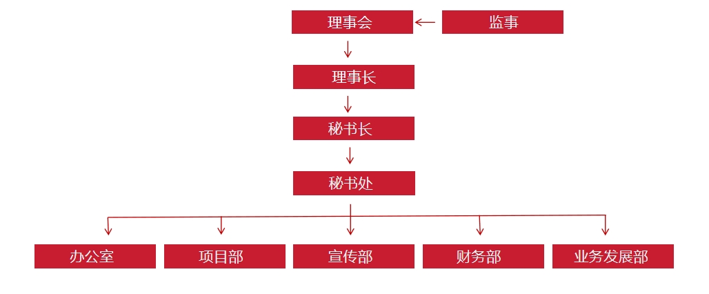 基金会的组织机构由理事会、监事组成。理事会承担决策职能,通过由理事长召集并主持的定期理事会会议,对基金会战略规划、年度计划、预算等重大事项进行审议和审批。理事会下设立一处一室四部门,分别是秘书处、办公室、项目部、宣传部、财务部和业务发展部。秘书处负责人为秘书长,全面负责基金会所有日常运营管理工作。组织机构设置如下: