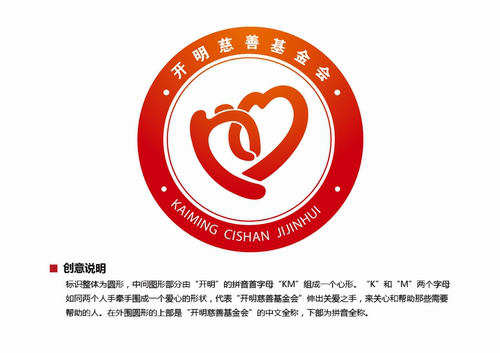 开明慈善基金会标志整体为圆形,中间图形部分由“开明”的拼音字母“KM”组成一个心形?!癒”和“M”两个字母如同两个人手牵手围成一个爱心的形状,代表“开明慈善基金会”伸出关爱之手,来关心和帮助那些需要帮助的人。在外围圆形的上部是“开明慈善基金会”的中文全称,下部为汉语拼音全称。主色调为红色、银色和金色。