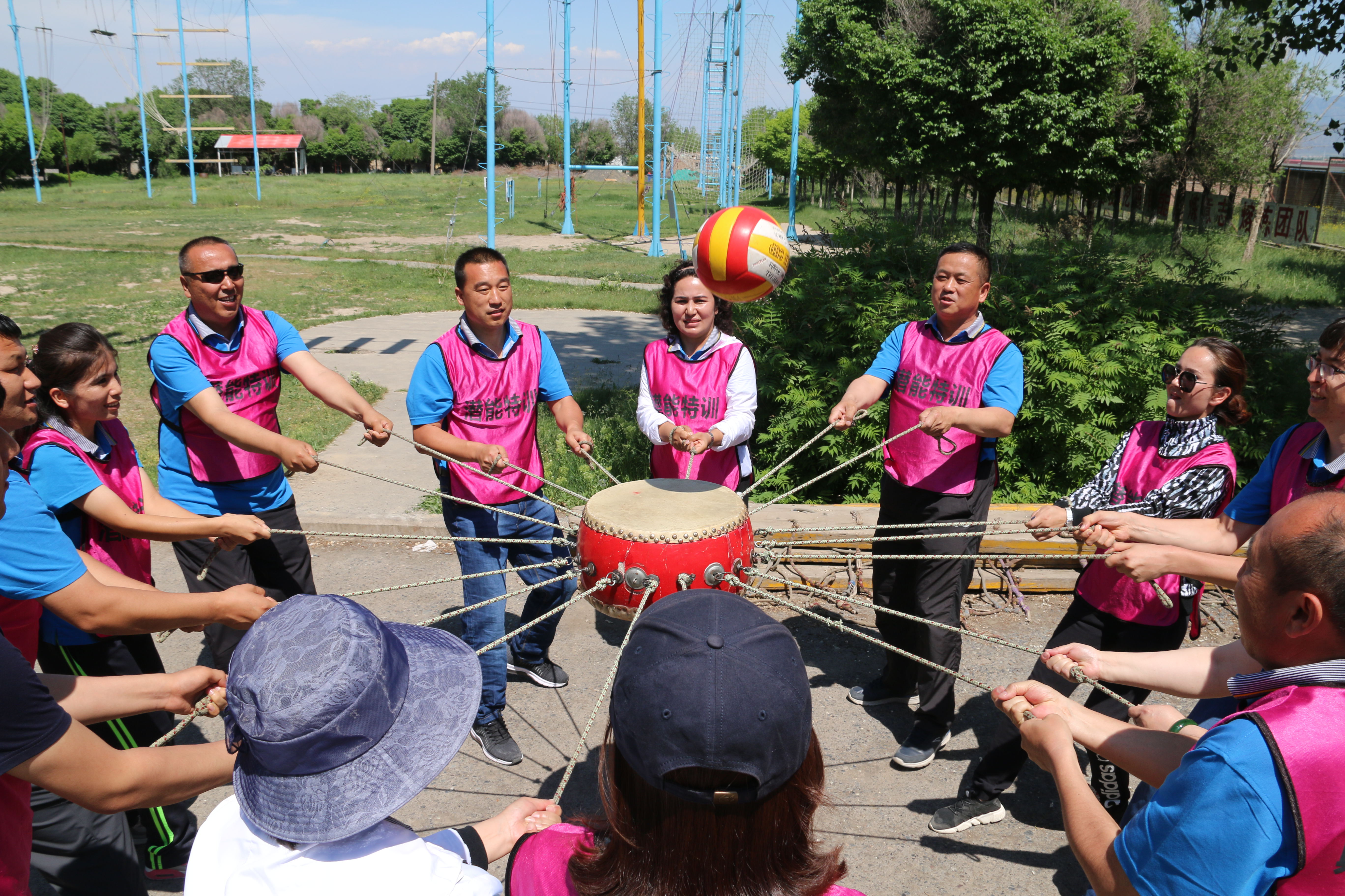 协同并肩,他们共同参与户外体验式培训,校长们分成四个战队,并分别命名霸王队、同心队、石榴队、南山队,仿佛又回到了小时候一般,大家积极参与,彼此信任,互相鼓励,激情满满,即使是悬殊的年龄差距也没有影响他们团队整齐划一的步伐。