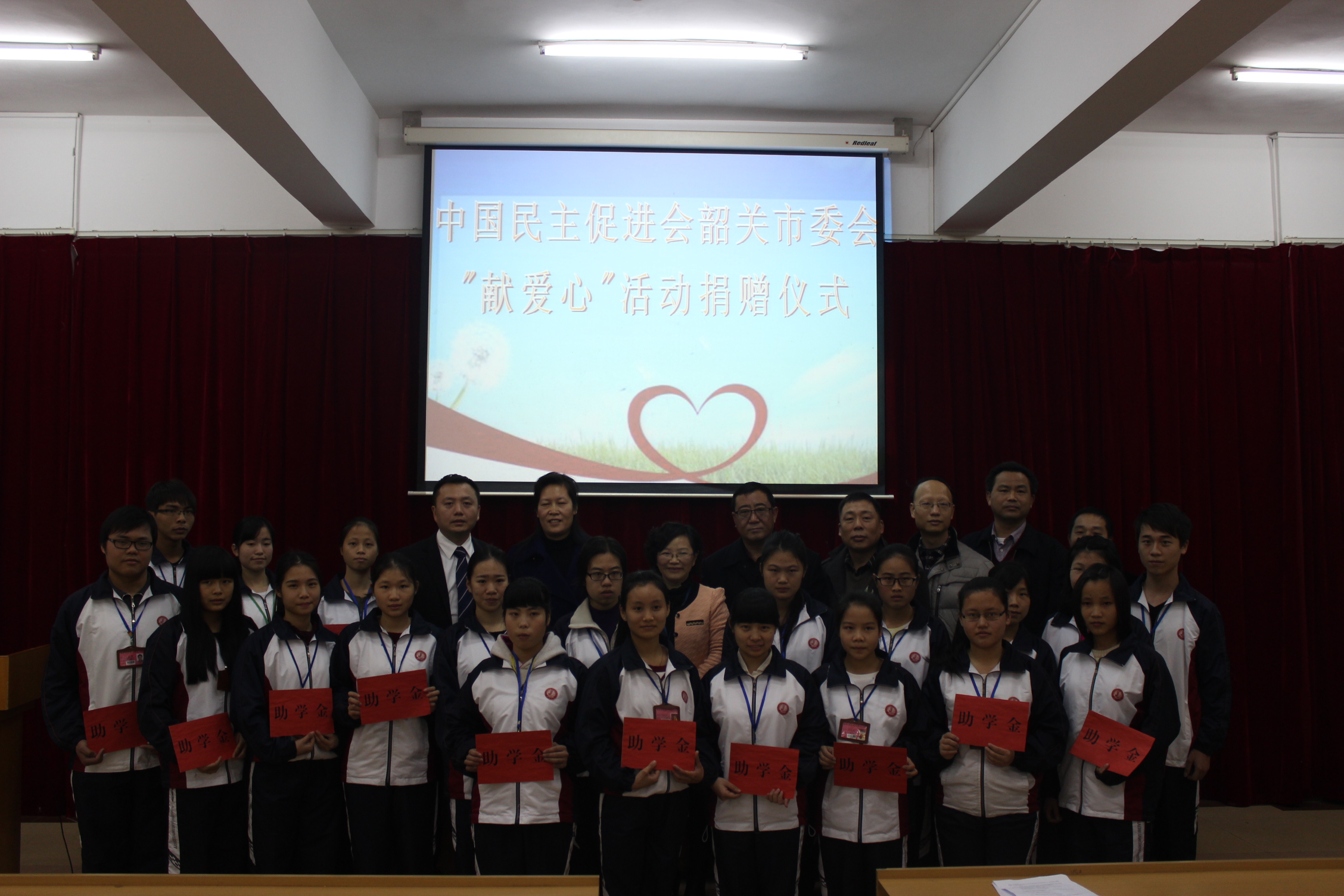 2015年1月6日,开明慈善基金会广东同心筑梦专项基金支持韶关市委会到韶关学院韶州师范分院开展“献爱心”活动,现场为20名贫困学生每人捐助500元。民进韶关市委副主委、市中级人民法院副院长宋良锋,市委委员、社会服务工委主任温荣华,民进民营企业家联谊会副会长邱小华、郑鸿沛,秘书长邓华和机关其他专干出席了捐助仪式。