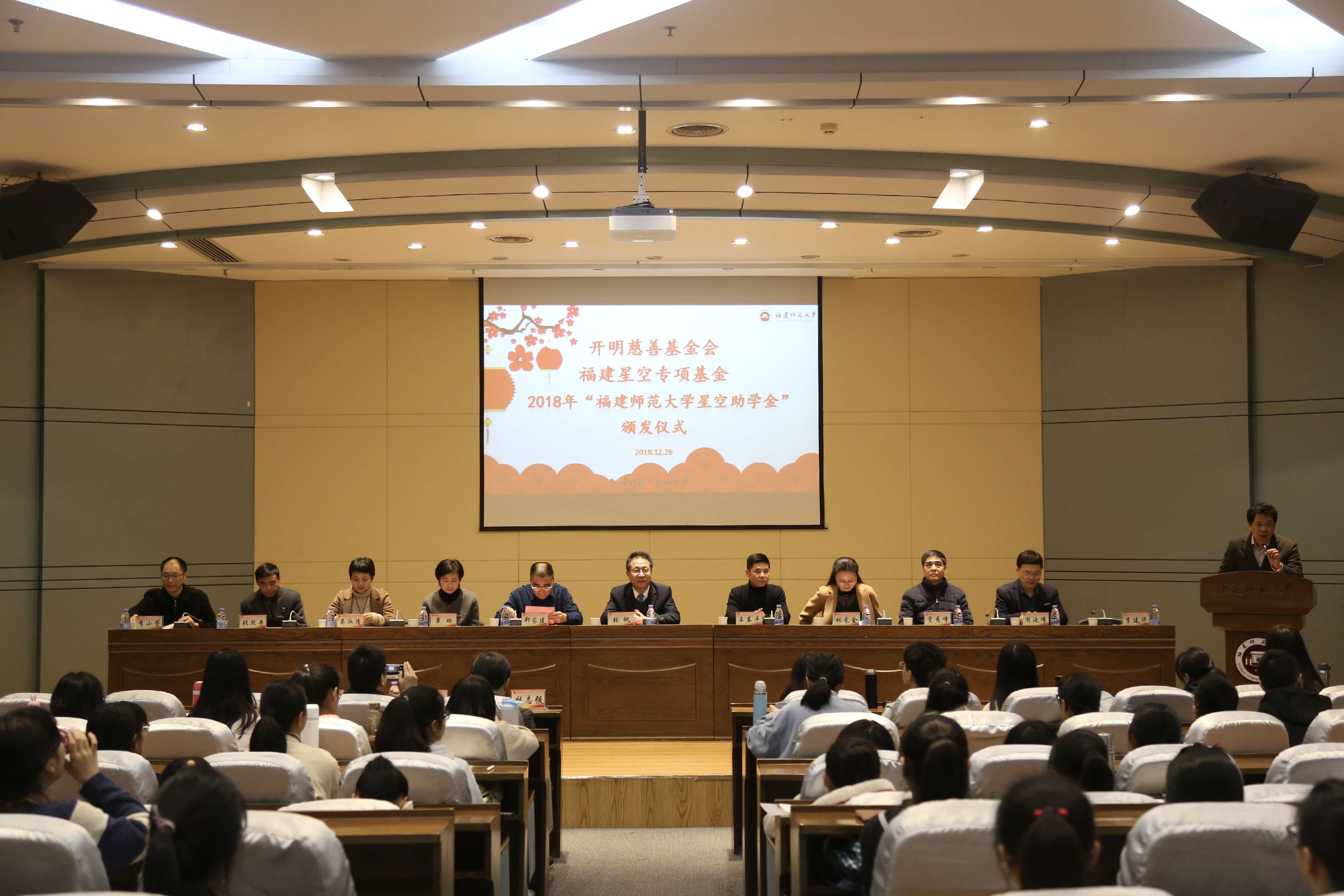 2018年12月26日下午,开明慈善基金会福建星空专项基金在福建师范大学仓山校区举行2018年度“星空助学金”颁发仪式。福建省文联主席、福建省社会科学院院长、民进福建省委原主委张帆,民进福建省委副主委、福建师范大学副校长郑家建,民进福建省委会秘书长林龙金,福建民进经济界会员联谊会会长、福建新思路集团有限公司董事长、福建师范大学星空助学金项目捐资者王东平出席仪式,并为100名受资助学生颁发助学金,福建师大相关部处负责人、师生代表参加以上活动,中共福建师大文学院党委书记李建华主持。