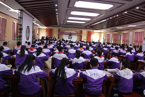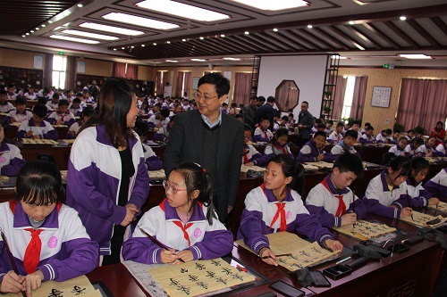 捐赠活动过后,寇学臣教授利用现代化教学系统,现场为广大学生讲解示范了课本“等”的写法,受到学生热烈的欢迎。在接下来举办的座谈会上,所在学校校长和书法教师提出了许多一线教学的困惑和问题,与会专家现场一一解答。