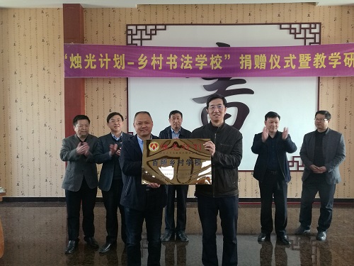 活动现场,潘光部长和曹志新书记分别为唐邱小学和北新艺术小学授牌,向两校捐赠书法教材950册价值16750元,并为学校安装了与语文课本同步的书法教学软件。寇学臣教授介绍了创建“烛光计划-乡村书法学?!钡囊庖澹涑踔跃褪墙徊皆銮课幕孕?,助力乡村教育振兴,发挥高校专业人才优势,带动贫困偏远乡村中小学书法教育的开展。