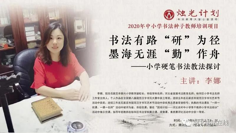 8月27日上午,石家庄市誉兴小学教学副校长——李娜老师通过腾讯视频会议,为全体学员进行《书法有路“研”为径、墨海无涯“勤”做舟》小学硬笔书法教法指导专题讲座。讲座的核心是“研”和“勤”。