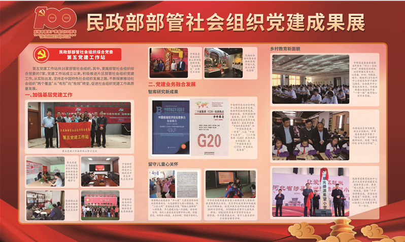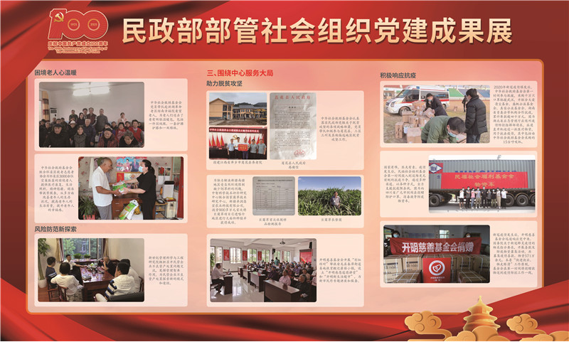 时值中国共产党成立100周年,为向党的百年华诞献礼,民政部部管社会组织综合党委主办,各部管社会社会组织积极参与,举办了部管社会组织党建成果展?;鸹帷巴摹げ屎缧卸毙陆3づ嘌蛋?、“同心彩虹行动·美育共建‘烛光计划’”、“开明感恩道德讲堂”和“开明新生活超市”、“抗击新冠肺炎疫情”四个项目和党支部活动照片光荣上榜,在成果展中进行展示宣传。