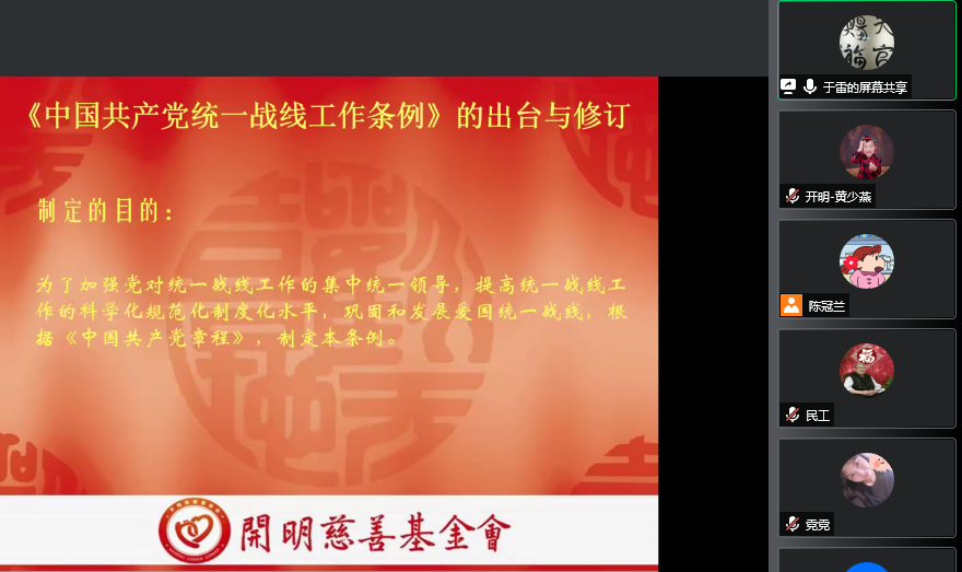 10月25日,为贯彻落实民政部社会组织综合党委关于《民政部部管社会组织党史学习教育实施方案》,开展党史学习教育,学好“四史”,在思想交流中增进学习效果、升华感悟认识??鞔壬苹鸹岬持Р渴榧?、秘书长于雷受民政部部管社会组织综合党委第五工作站邀请,讲授 “从《中国共产党统一战线工作条例》的修订,感悟统一战线这一‘重要法宝’”主题党课?;鸹崛宓吃?、第五党建工作站部管社会组织通过线上方式参加了此次党史学习教育。