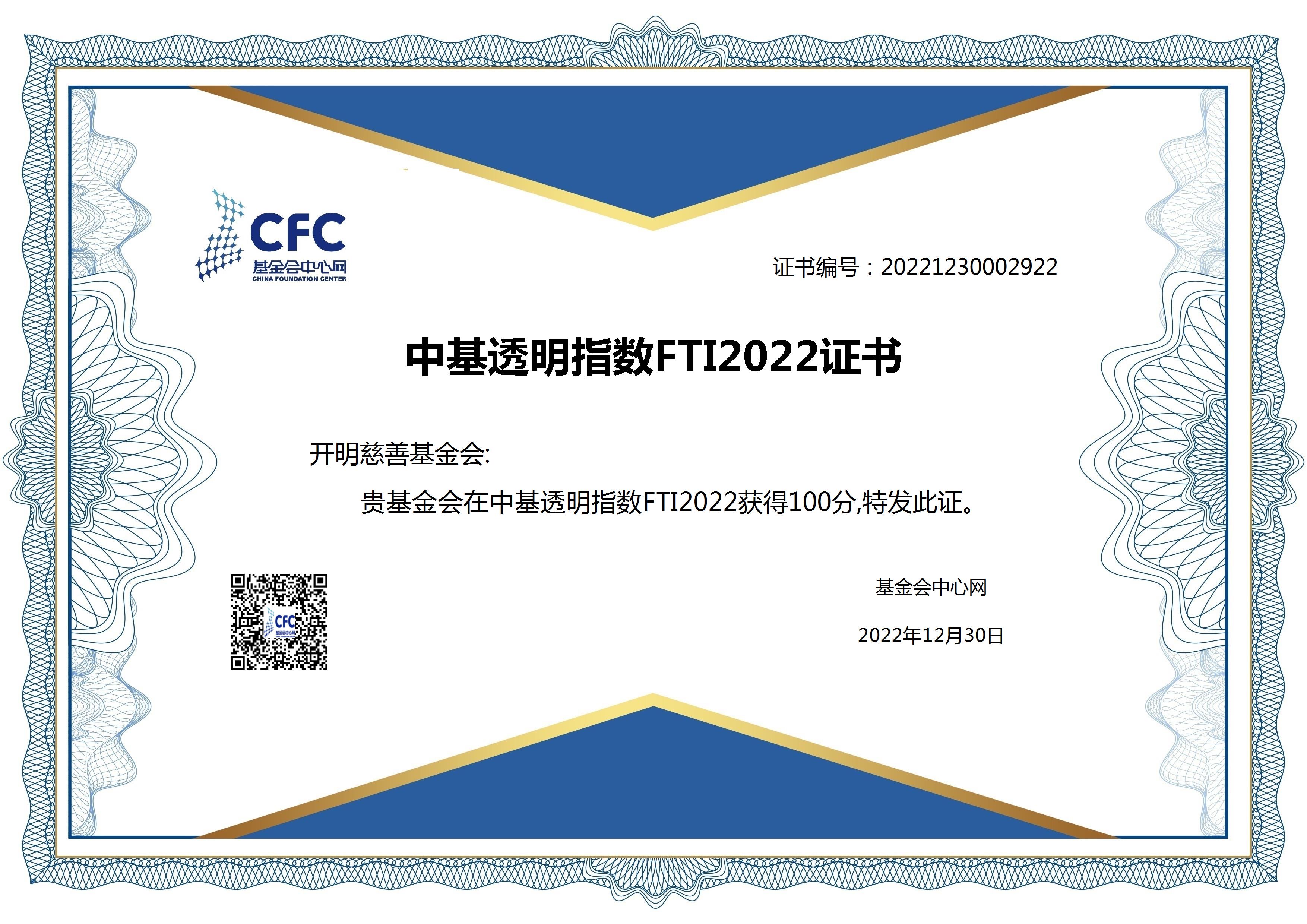 近日,“多维度解锁透明公益——中基透明指数FTI2022发布会”在线上举行,中国基金会的透明度大考“成绩单”也新鲜出炉??鞔壬苹鸹嵩?022年中基透明指数FTI获得100分,在推进慈善事业发展的道路上砥砺奋进、戮力前行。