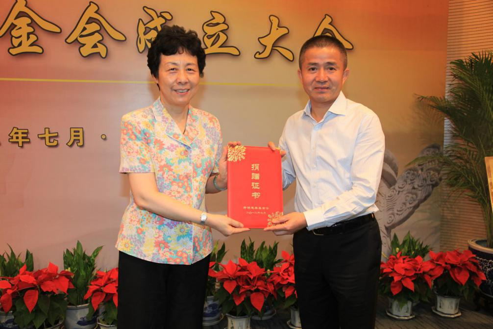 严隽琪名誉理事长在开明慈善基金会成立大会向丁建勇先生发放捐赠证书