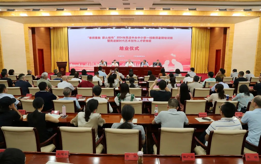 7月18日下午,“尊师重教 薪火相传”2024年民进中央中小学一线教师暑期培训班暨民进新时代艺术创作人才研修班结业式在中央社会主义学院举行。全国政协副主席、民进中央常务副主席朱永新出席结业式并讲话,全国人大常委会委员、民进中央副主席王刚主持。
